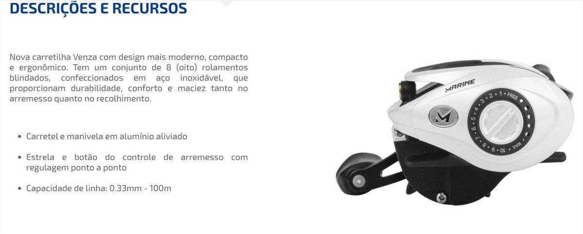 Reel de bajo perfil Fabricado con un nuevo diseño más moderno, compacto y ergonómico. Posee un conjunto de 8 rulemanes blindados, fabricados en acero inoxidable, los cuales proporcionan durabilidad, confort y suavidad tanto en el lance como en la recogida. Carrete y manija en aluminio extra liviano. Estrella y botón de control de lance con regulación de punto a punto.
